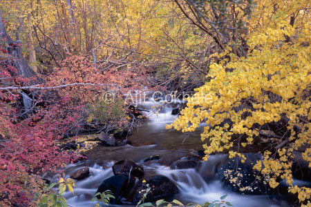 A classic image in the fall season, with white water flowing over black granite in a colorful forest.