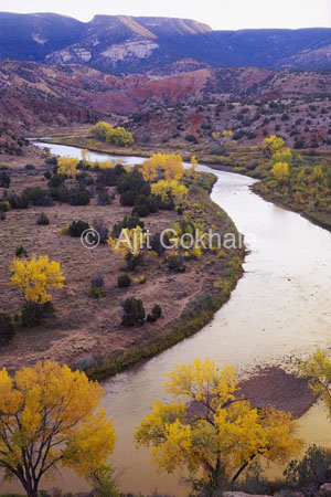 22301 Chama River The Chama river makes an 'S' turn north of Santa Fe, NM. The cottonwoods are ablaze in the fall colors contrasting with their dark trunks. The late evening provided the even lighting at this spot at 6700 feet elevation. |