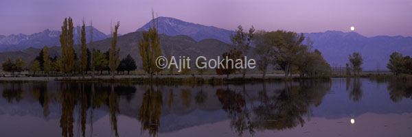 41604 Sierra moon I scouted this location during the day and estimated when and where the moon will set the next morning. These estimates are not very accurate because of the different heights of the mountains. I returned the next morning in the dark, waited for the moon to touch the mountain top and made this image just before sunrise. Three horizontal images were joined together to make this panorama. A very large print (24x60 inches) is available. |